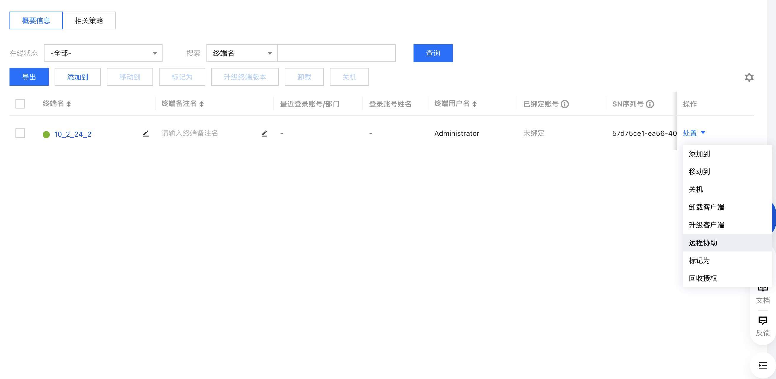 在 终端信息 菜单栏中我们可以看到终端的概要信息,同时可以远程卸载、升级客户端,以及远程协助等。
