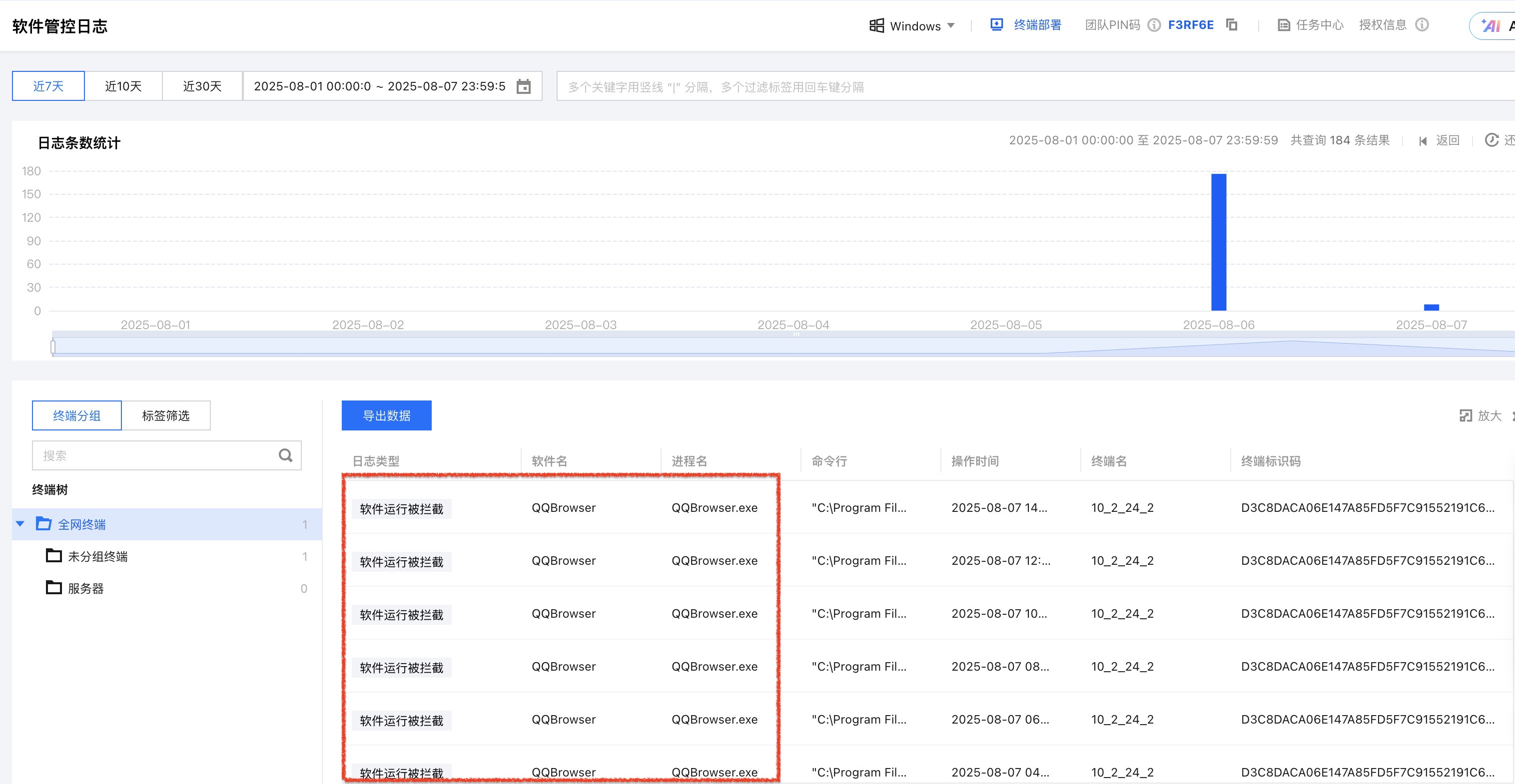 软件管控日志就是终端触发禁止运行策略的日志信息,我们之前新建了一个禁止QQ浏览器运行的策略,然后再 iOA 用户终端多次运行QQ浏览器都被禁止了,禁止运行记录就可以在软件管控日志中查看,其中包括进程名称、命令行以及操作时间。
