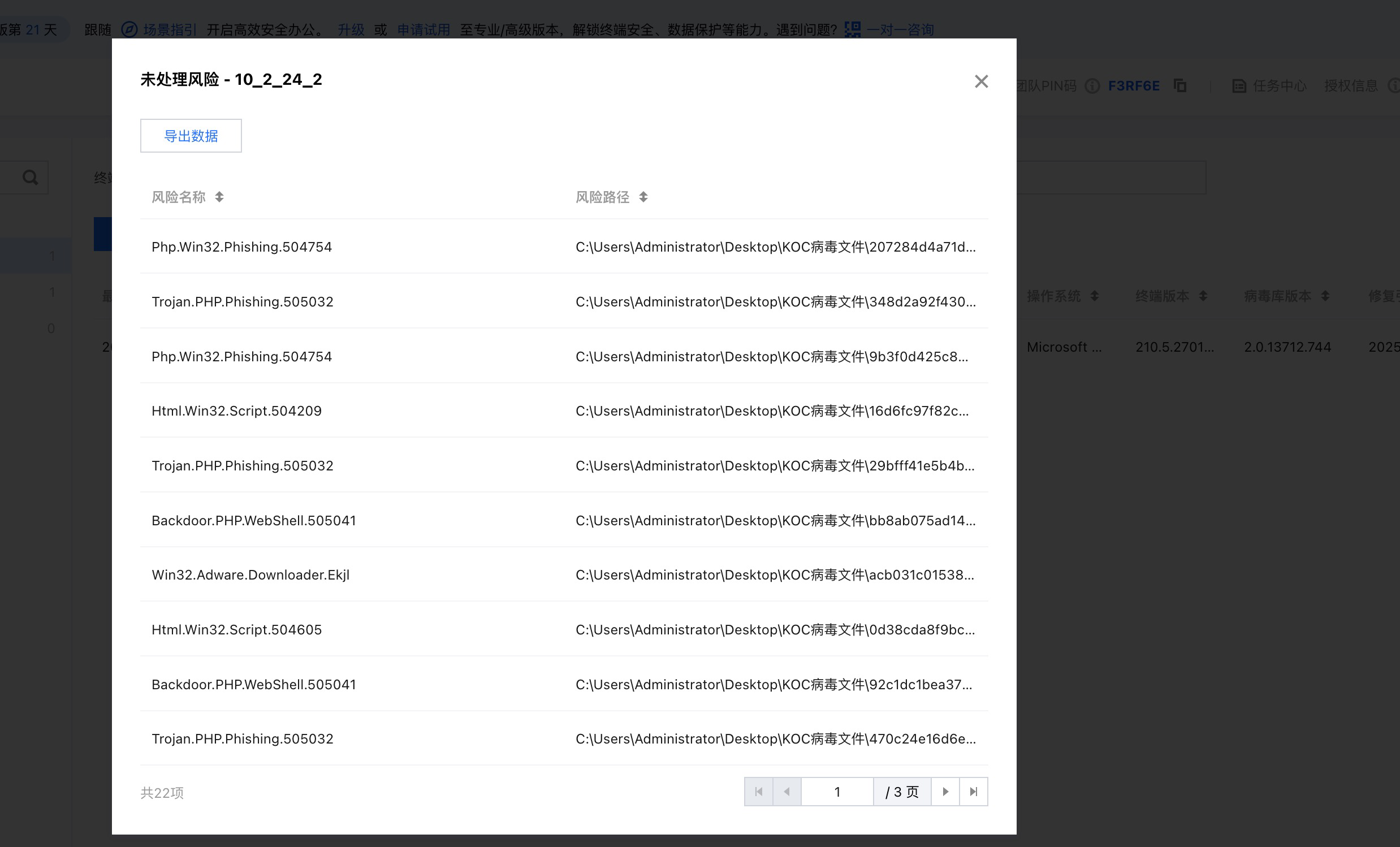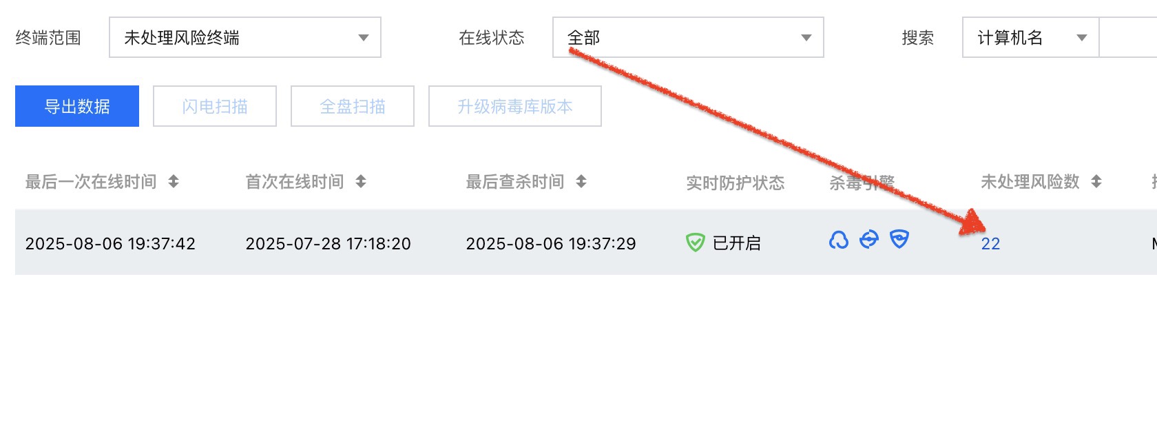 等待任务执行完成之后,在终端记录中的 未处理风险数 就可以看到扫描的风险文件个数。