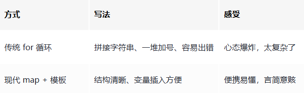 下次写代码的时候,别再用老式的 for 循环拼接字符串啦,试试这些现代写法,让你的代码也拥有“高颜值 + 高智商”!