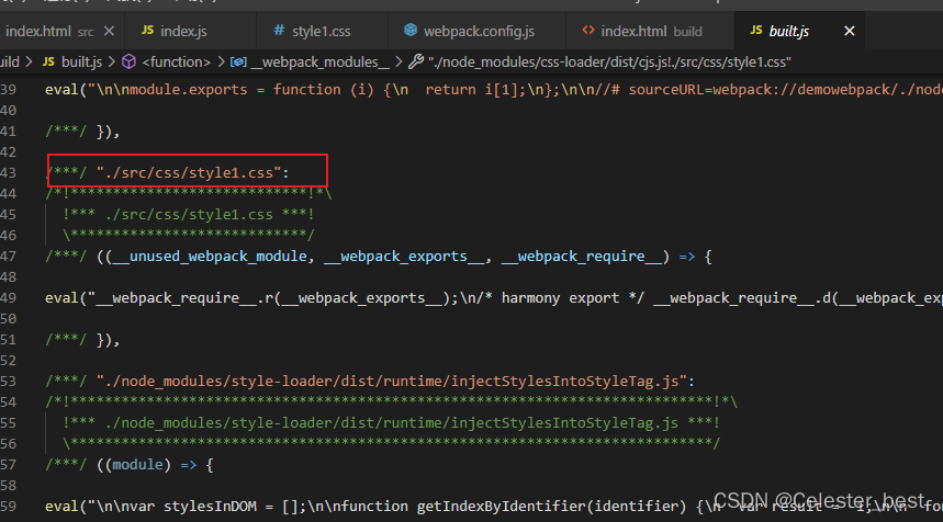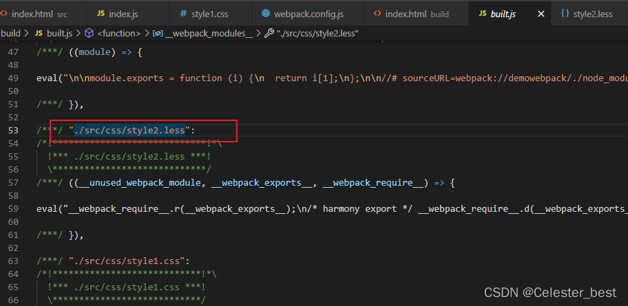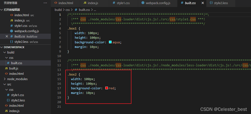 运行webpack命令之后,可以发现less文件也被打包到built.css文件中了