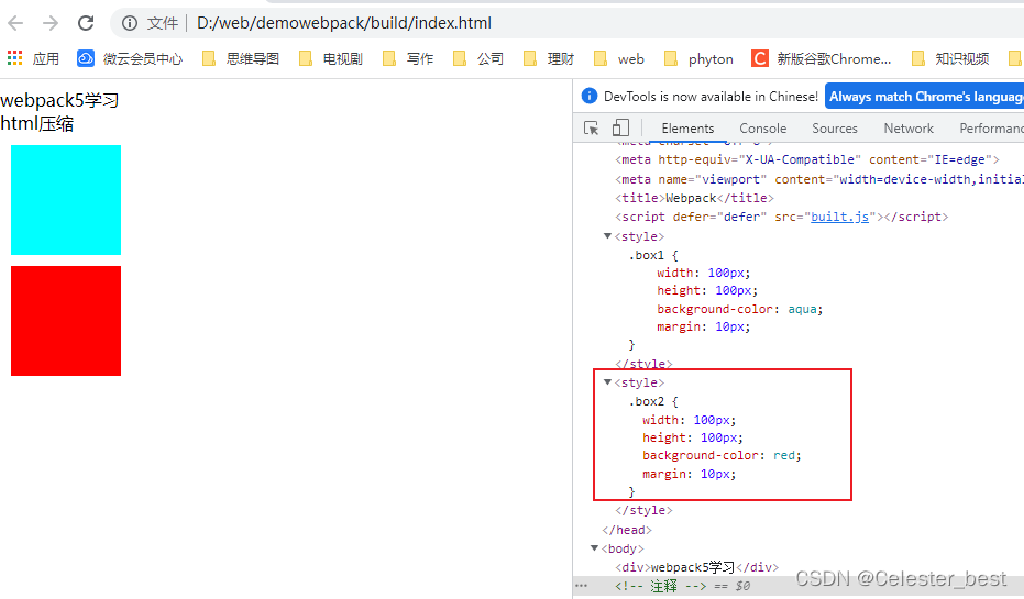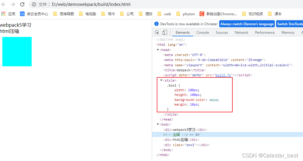 在浏览器中运行打包输出的index.html文件,可以看到样式已经嵌入到style标签中了