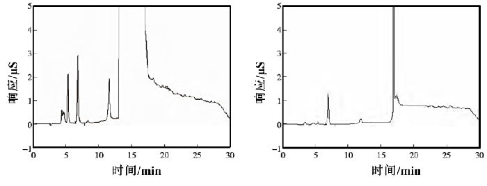刘爽等人[5]采用离子色谱法测定了农用硫酸铵中4种杂质阴离子。在样品前处理时,需通过Ba离子柱过滤除去试液中的硫酸根离子。研究中Ba离子柱的容量为2.0~2.2 meq/ml,实验过程中分别对未使用Ba离子柱净化及使用该柱净化的样品进行测试,结果表明,未使用Ba离子柱净化的样品,SO42-离子拖尾,严重干扰SCN-的测定,色谱图如图4左图所示,无法计算加标回收率;使用Ba离子柱净化的样品,在保留时间20 min左右基线平稳,对SCN-的测定无影响,色谱图如图4右图所示。经Ba离子柱净化后样品回收率在80.23%~111.5%,可满足实验室分析要求。利用本方法可以同时检测农用硫酸铵中4种常见杂质阴离子含量,方法简单、快捷、准确,因而值得推广应用。