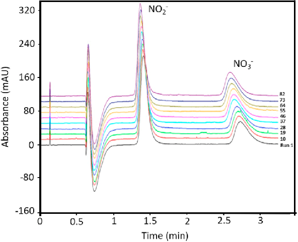 Murray等人[4] 采用离子色谱仪对水中杂质进行了成分分析,基于简单的阴离子交换方法,使用KOH洗脱液结合AG15保护柱来实现快速的阴离子分离。通过使用基于235 nm LED的吸光度检测器,可以选择性,直接地检测亚硝酸盐和硝酸盐。作者选择位于淡水和高污染废水之间的50μL样品定量环体积,连续分析包含15 mg L-1 NO3-和10 mg L-1 NO2-的阴离子标准液。依次进样的色谱图重叠时,仪器获得的色谱图重复性如图3所示。在82次运行中,亚硝酸盐和硝酸盐的峰面积RSD值分别为3.87%和3.91%。发现亚硝酸盐和硝酸盐的保留时间RSD值分别为3.59%和3.23%,这表明了离子色谱在水质检测中的突出应用价值。