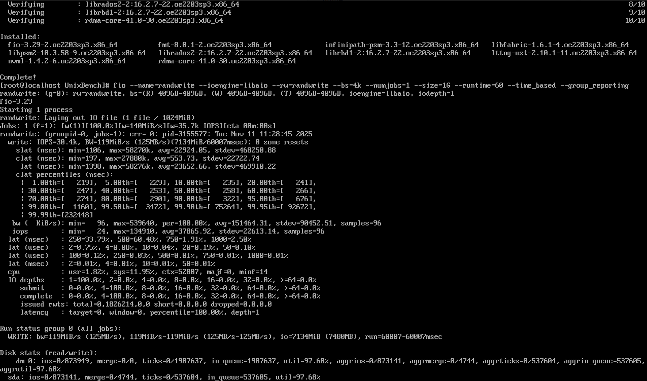 - 存储类型适配:结果符合 NVMe SSD 性能特征 —— 顺序读写带宽超 1.9 GiB/s,4K 随机读 IOPS 达 18.6 万、随机写 15.8 万,若为 SATA SSD,性能会下降约 50%(顺序带宽 800-1000 MiB/s,随机读 IOPS 8-10 万);