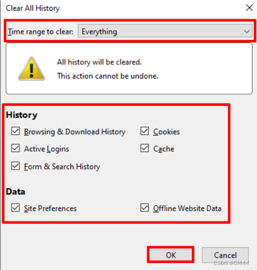 3.在打开的“清除所有历史记录”窗口中,在“清除的时间范围:”字段中选择“Everything”(全部)。我们还要勾选所有项目的复选框,然后点击“确定”。