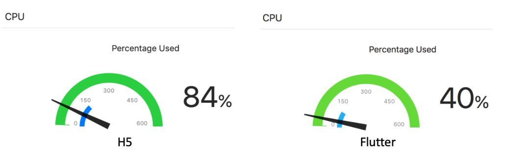 从 CPU 的占用率来看,Flutter 占用的 CPU 要远远小于 H5 页面。