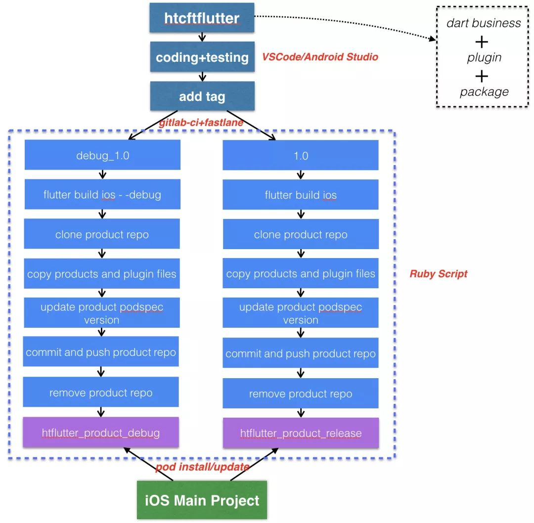 第二个问题,我们参考的是 CocoaPods 的 pod 发布流程,将 Flutter 主工程作为一个私有 repo 来看待,通过 tag 触发脚本生成产物,再 push 到htflutter_product_debug和htflutter_product_release。具体流程如下图: