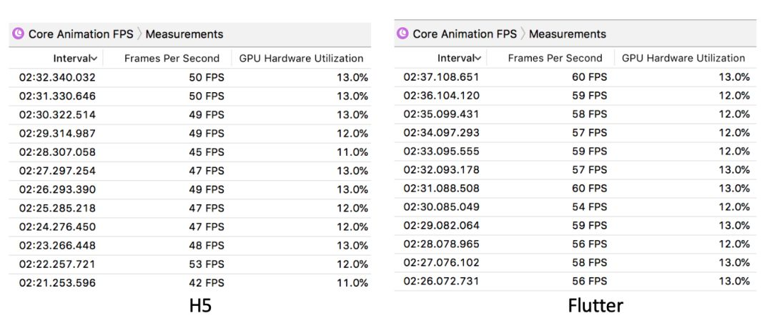 从上图可以看出,Flutter 的 FPS 接近 60,和原生效果基本一致,而 H5 的 FPS 在 50 左右,远不如 Flutter 优秀。两者的 GPU 使用率基本相同。