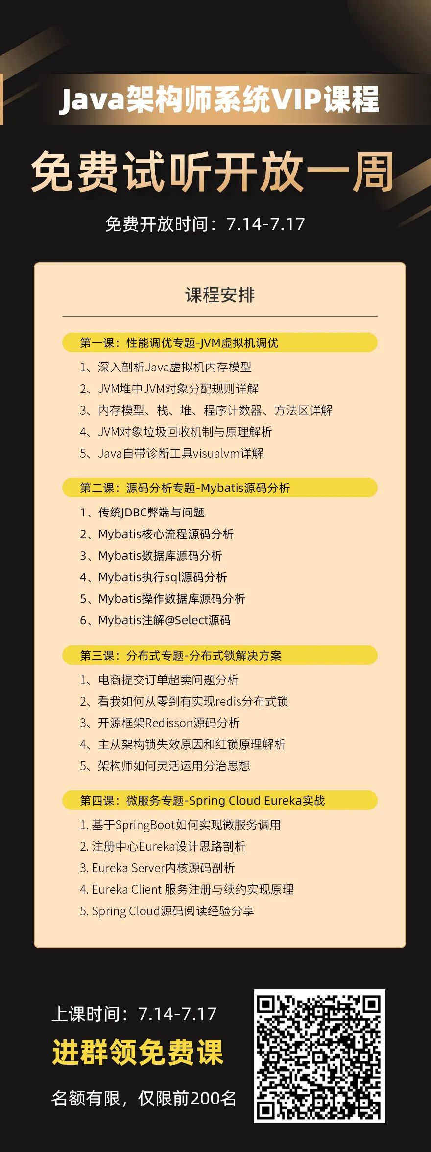 现在有一个以学习源码、解读源码而开放的Java架构师系统VIP课程免费试听开放一周,课程将解决Java程序员不同成长阶段的问题,并在项目迭代中解决各个项目阶段的问题,还原开发经历,实现能力全面升级。
