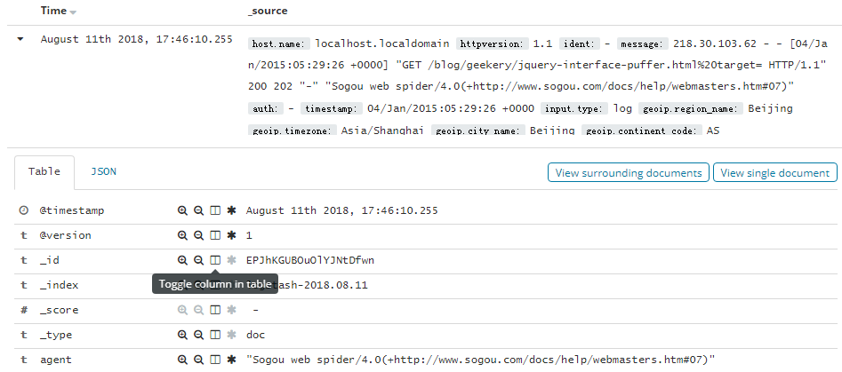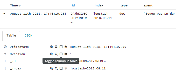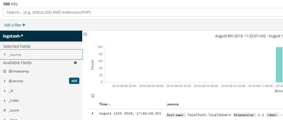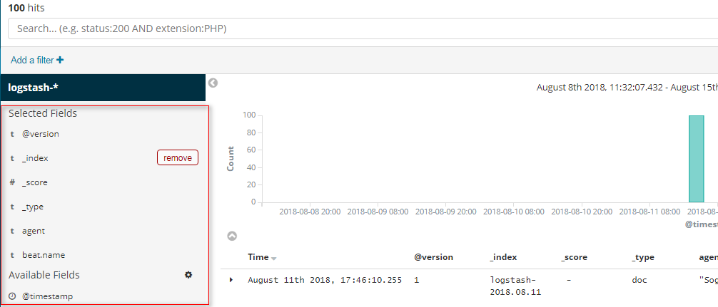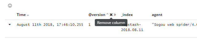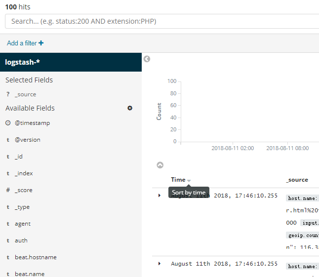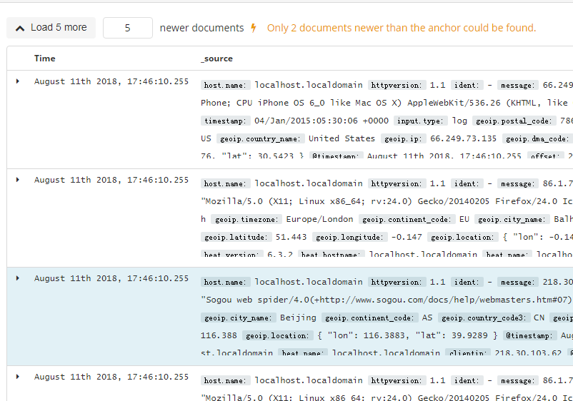 当你提交一个查询请求时,直方图、文档表和字段列表都会更新,以反映搜索结果。命中(匹配到的文档)总数会显示在工具栏中。文档表格中显示了前500个命中。默认情况下,按时间倒序排列,首先显示最新的文档。你可以通过点击“Time”列来逆转排序顺序。