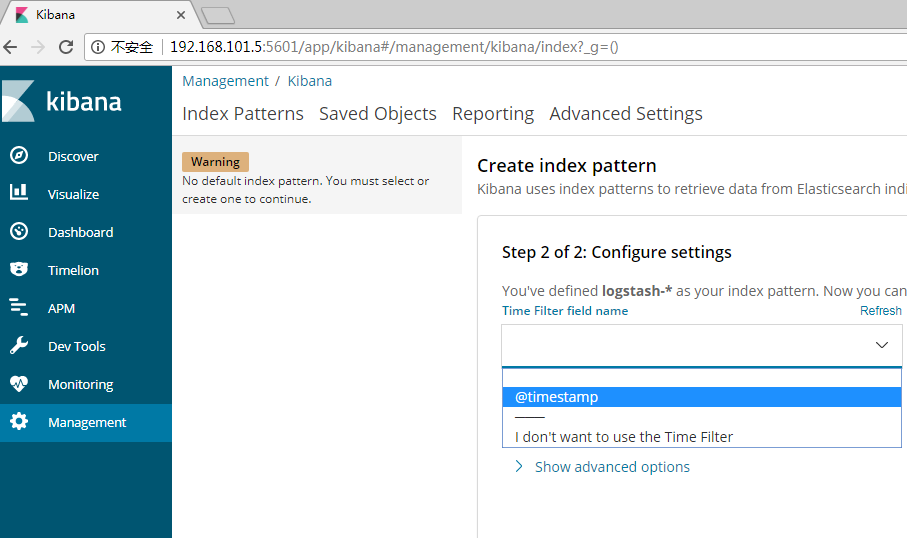 4、点击“Create index pattern”按钮来添加索引模式。第一个索引模式自动配置为默认的索引默认,以后当你有多个索引模式的时候,你就可以选择将哪一个设为默认。(提示:Management > Index Patterns)