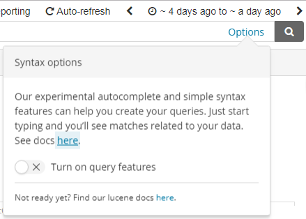 你可以在搜索框中输入查询条件来查询当前索引模式匹配的索引。在查询的时候,你可以使用Kibana标准的查询语言(基于Lucene的查询语法)或者完全基于JSON的Elasticsearch查询语言DSL。Kibana查询语言可以使用自动完成和简化的查询语法作为实验特性,您可以在查询栏的“选项”菜单下进行选择。