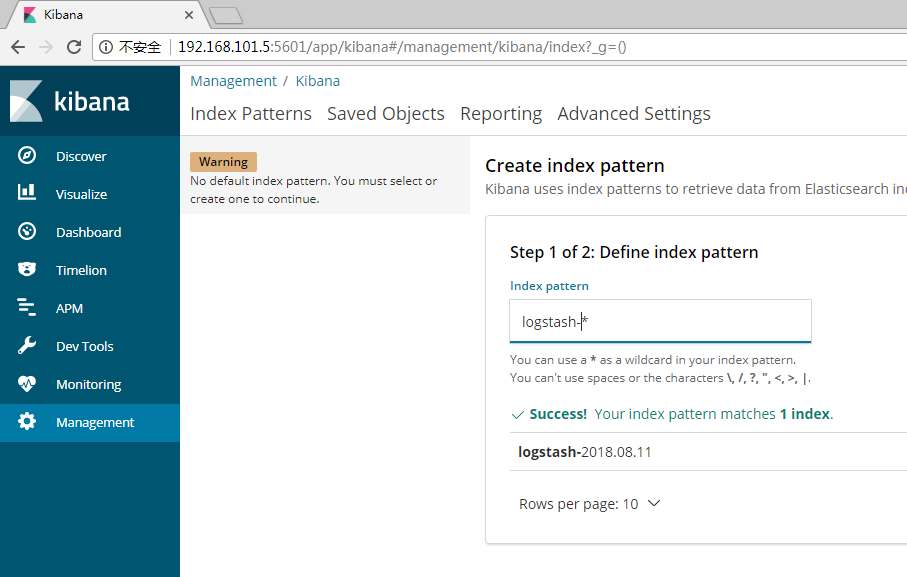 2、指定一个索引模式来匹配一个或多个你的Elasticsearch索引。当你指定了你的索引模式以后,任何匹配到的索引都将被展示出来。