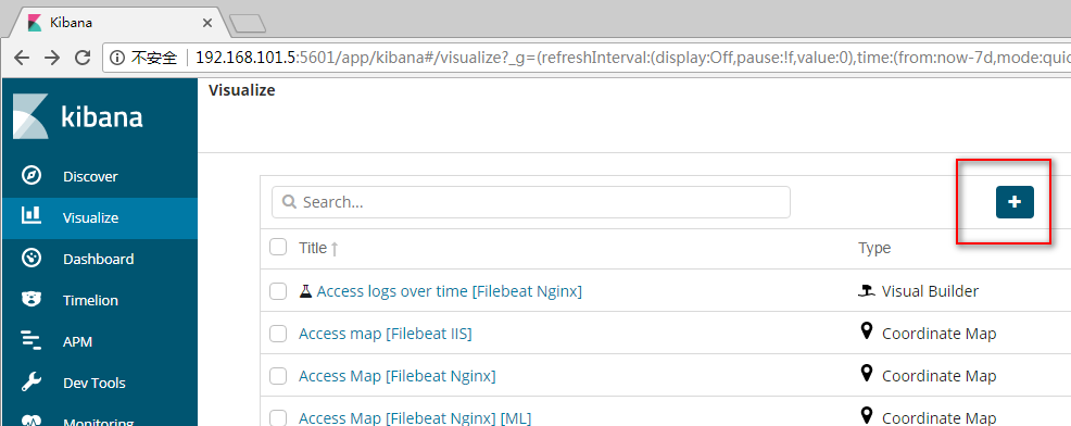 第2步:点击“Create new visualization”按钮或者**加号(+)**按钮