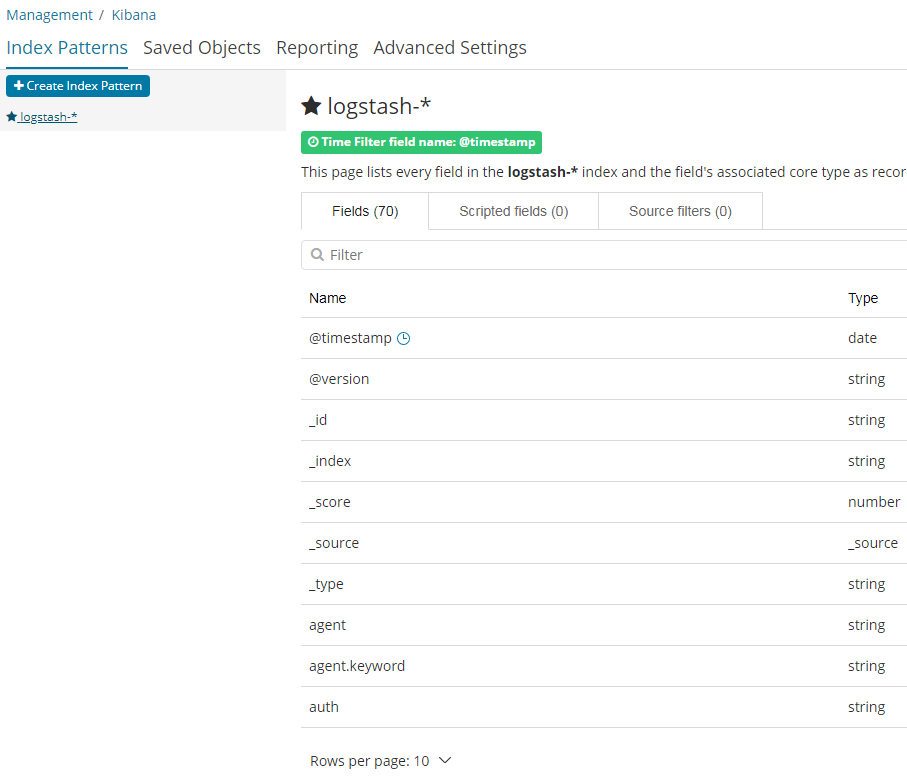 现在,Kibana已经连接到你的Elasticsearch数据。Kibana展示了一个只读的字段列表,这些字段是匹配到的这个索引配置的字段。