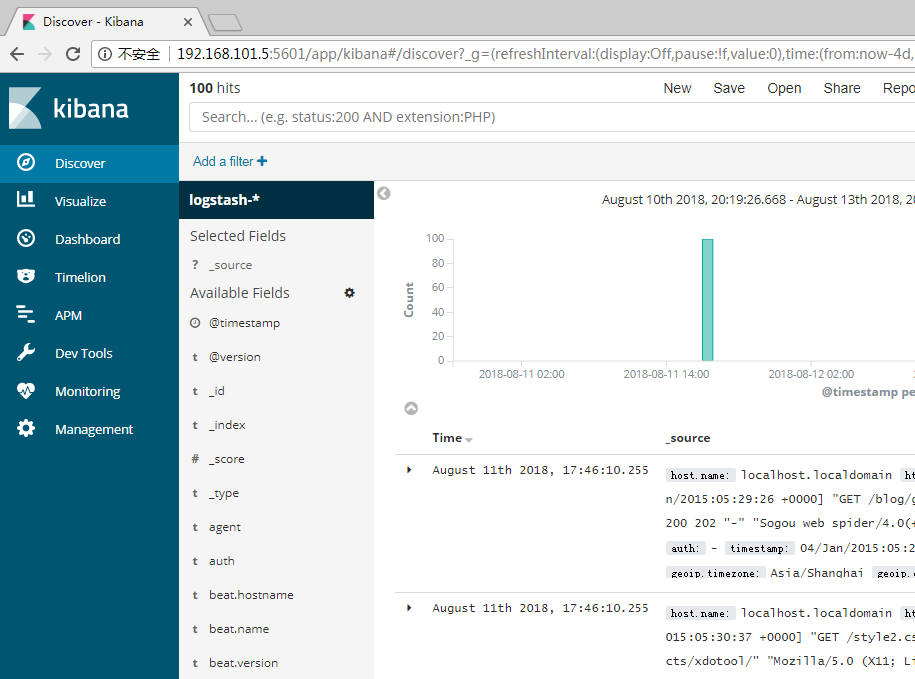 你可以从Discover页面交互式的探索你的数据。你可以访问与所选择的索引默认匹配的每个索引中的每个文档。你可以提交查询请求,过滤搜索结构,并查看文档数据。你也可以看到匹配查询请求的文档数量,以及字段值统计信息。如果你选择的索引模式配置了time字段,则文档随时间的分布将显示在页面顶部的直方图中。