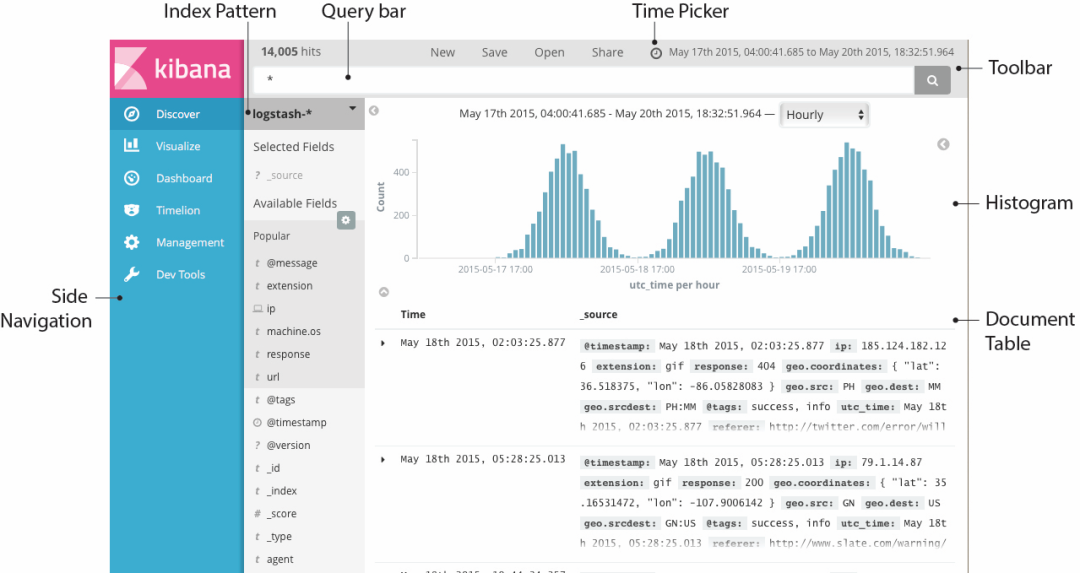 你用Kibana来搜索,查看,并和存储在Elasticsearch索引中的数据进行交互。