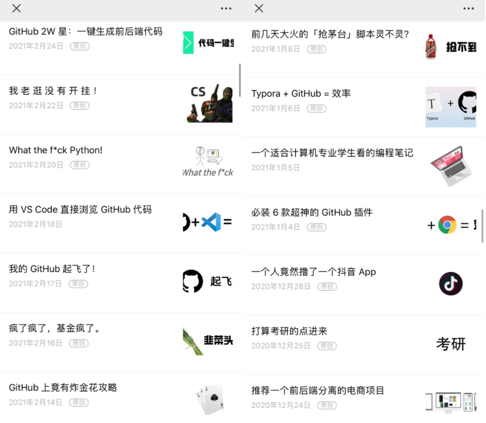 相比这些文章在其它公众号上也刷到过,它的公众号也是清一色的原创: