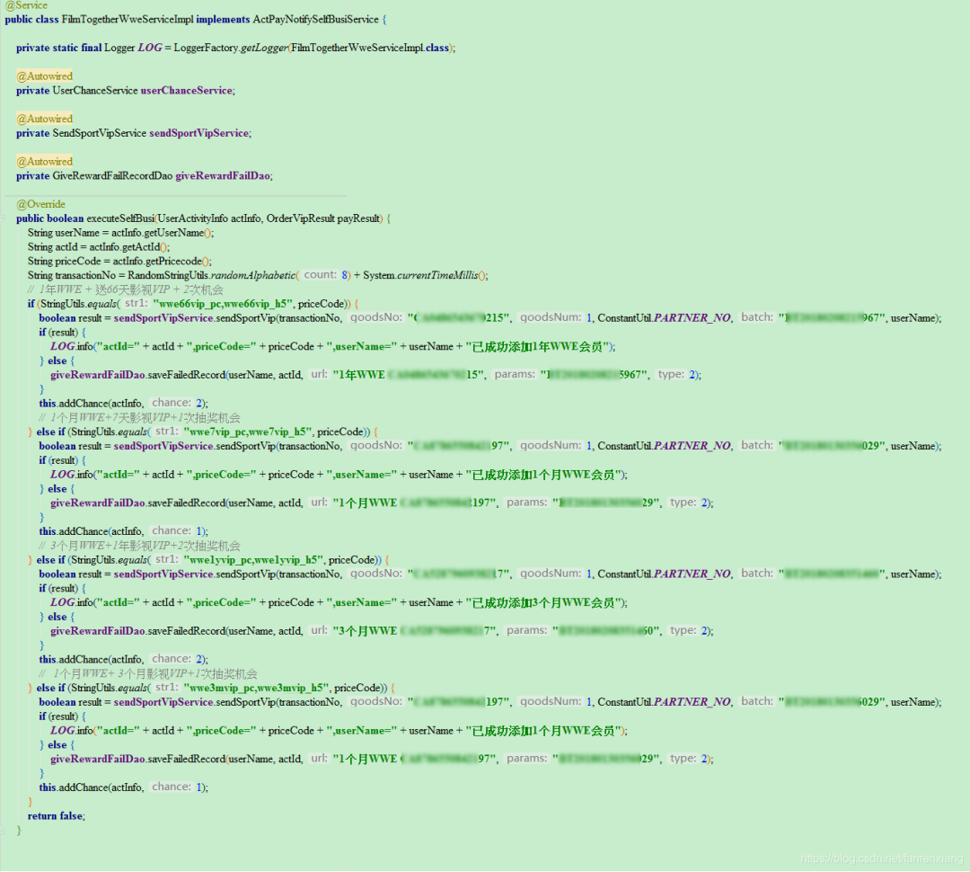接下来先附上一段很久以前自己写的业务代码,核心逻辑就是在支付回调中根据用户购买的价格包赋予用户对应的权益(VIP视频会员天数+抽奖机会次数)。
