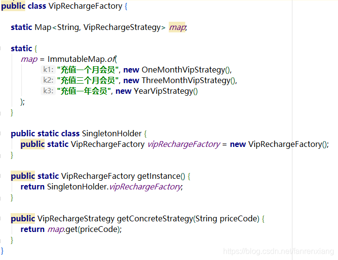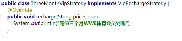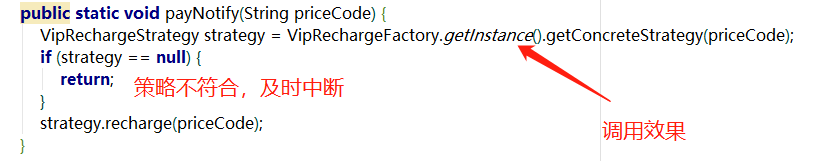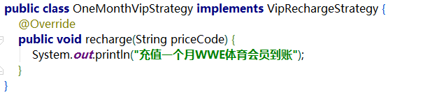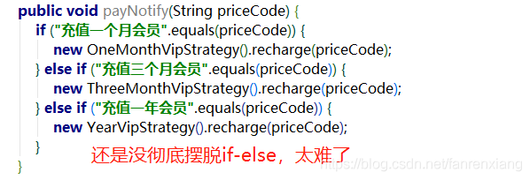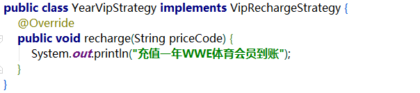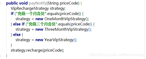 表面上看,代码稍微优雅了点,但是还是没和if-else彻底说拜拜,且recharge()充值方法可单独拎出来,只需要根据priceCode实例化不同的策略对象即可: