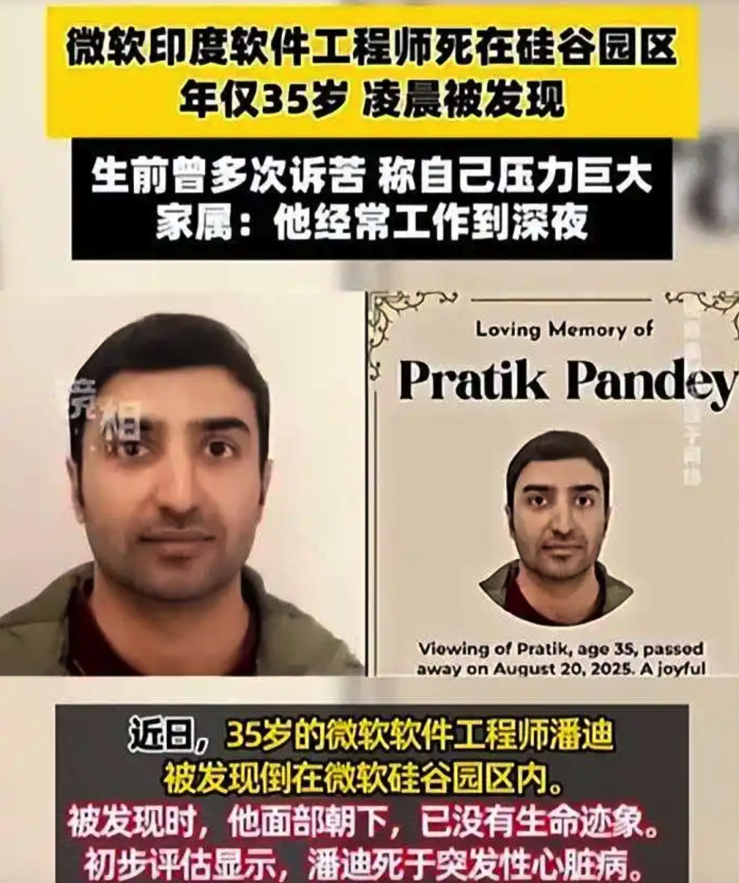 当地时间8月20日凌晨,35岁的微软软件工程师普拉蒂克·潘迪被发现倒在微软硅谷园区院子内。被发现时,他面部朝下,已没有生命迹象。美国加州圣克拉拉县法医办公室的初步评估显示,潘迪死于突发性心脏病。当地社区知名人物萨蒂什·钱德拉透露,在此之前,潘迪没有任何已知的健康问题。钱德拉在采访中表示,潘迪生前曾多次向室友和同事诉苦,称自己经常熬夜,“压力巨大,需要同时兼顾多个项目”。