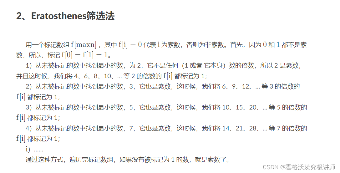 [1,\sqrt n][1,n] 范围内的素数可以通过筛选法预先筛出来,用一个数组 f[i]标记 ii 是素数与否,筛选法有很多,这里介绍一种最常用的筛选法——Eratosthenes筛选法。