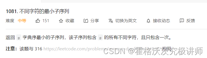 和之前的单调栈相同,如果遍历元素大于栈顶元素ascii码并且栈顶元素在之后还会出现(用哈希表记录lastindex实现),就逐个移除栈顶元素