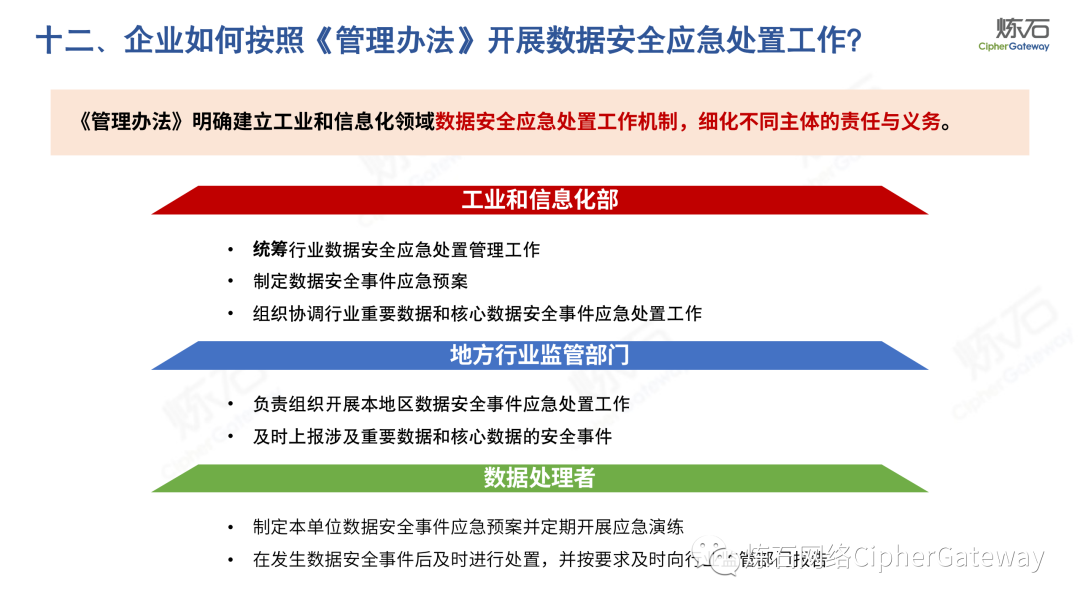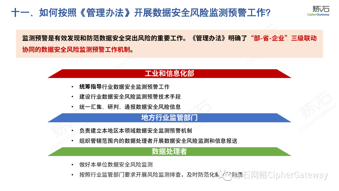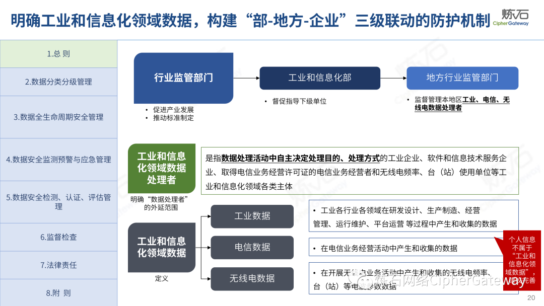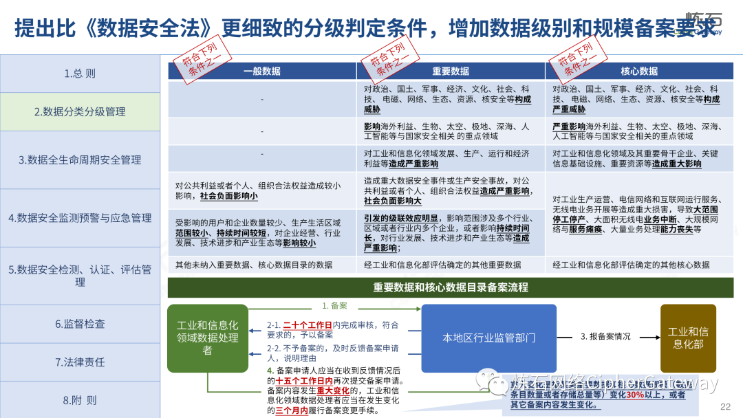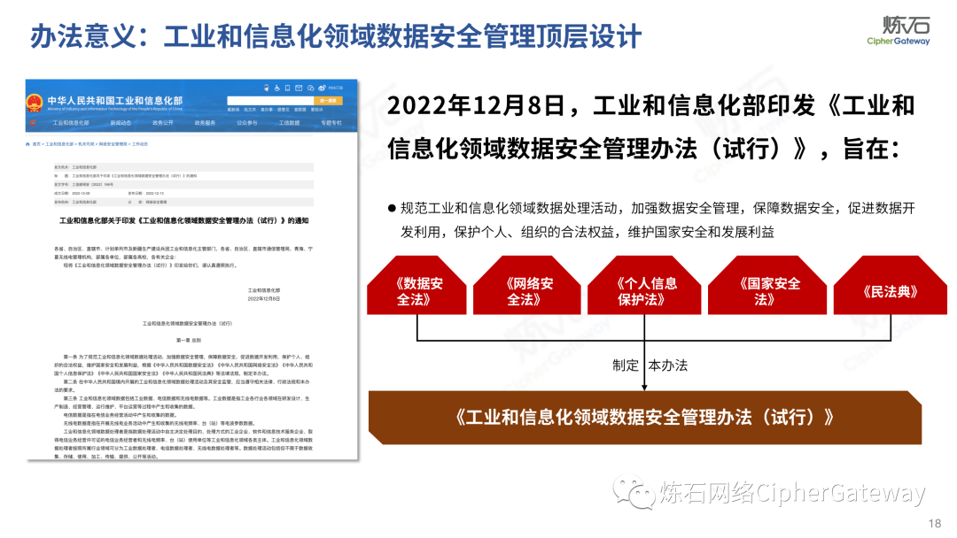 多行业积极出台数据安全法规。各行业在落实顶层规划时,结合本行业特色进行立法创新,相继出台规范本行业数据管理要求,体现了政策的统一性、规则的一致性、执行的协同性,充分发挥法治的引领、规范、保障作用,为加快建立全国统一的数据要素市场制度规则、推动中国式现代化发展提供有力支撑。2022年12月13日,工业和信息化部发布《工业和信息化领域数据安全管理办法(试行)》,旨在规范工业和信息化领域数据处理活动,加强数据安全管理,保障数据安全,促进数据开发利用,保护个人、组织的合法权益,维护国家安全和发展利益。