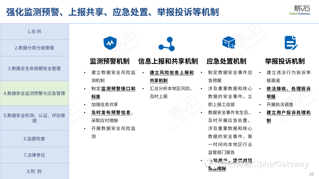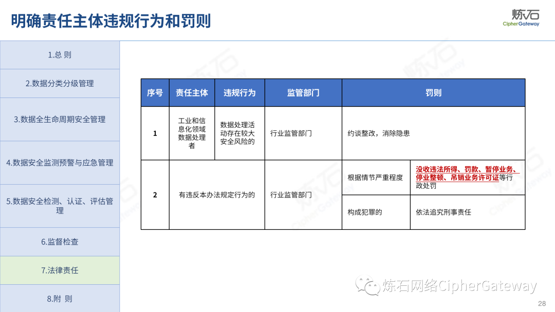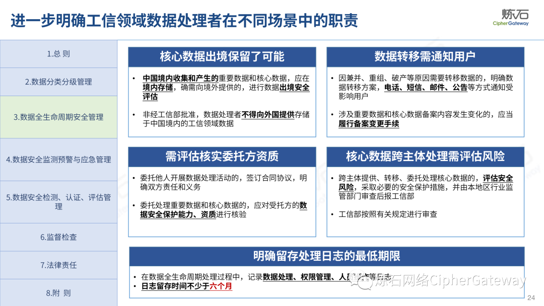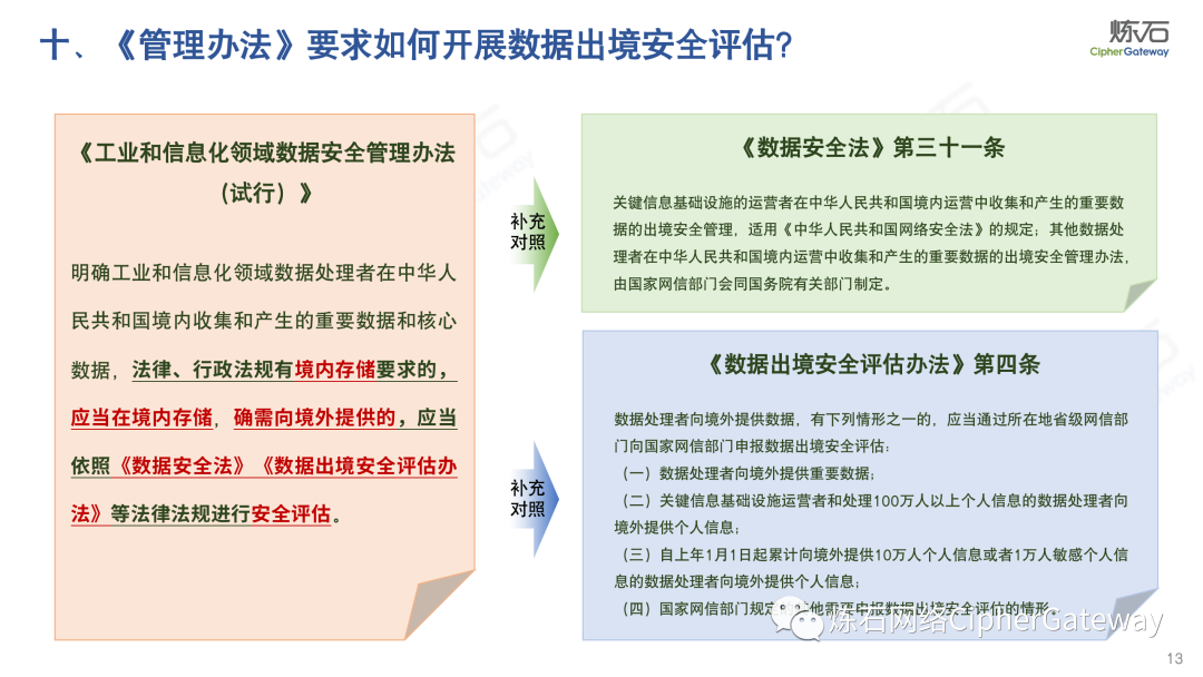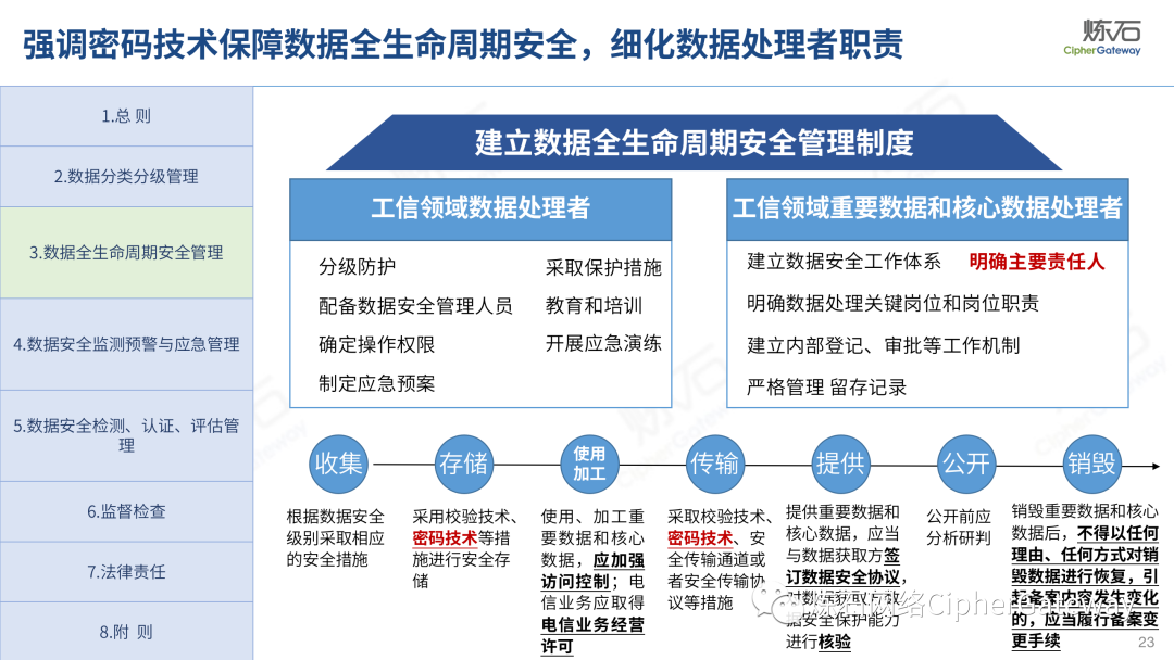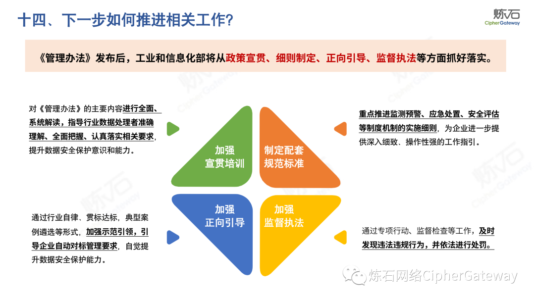 多行业积极出台数据安全法规。各行业在落实顶层规划时,结合本行业特色进行立法创新,相继出台规范本行业数据管理要求,体现了政策的统一性、规则的一致性、执行的协同性,充分发挥法治的引领、规范、保障作用,为加快建立全国统一的数据要素市场制度规则、推动中国式现代化发展提供有力支撑。2022年12月13日,工业和信息化部发布《工业和信息化领域数据安全管理办法(试行)》,旨在规范工业和信息化领域数据处理活动,加强数据安全管理,保障数据安全,促进数据开发利用,保护个人、组织的合法权益,维护国家安全和发展利益。