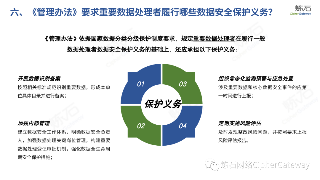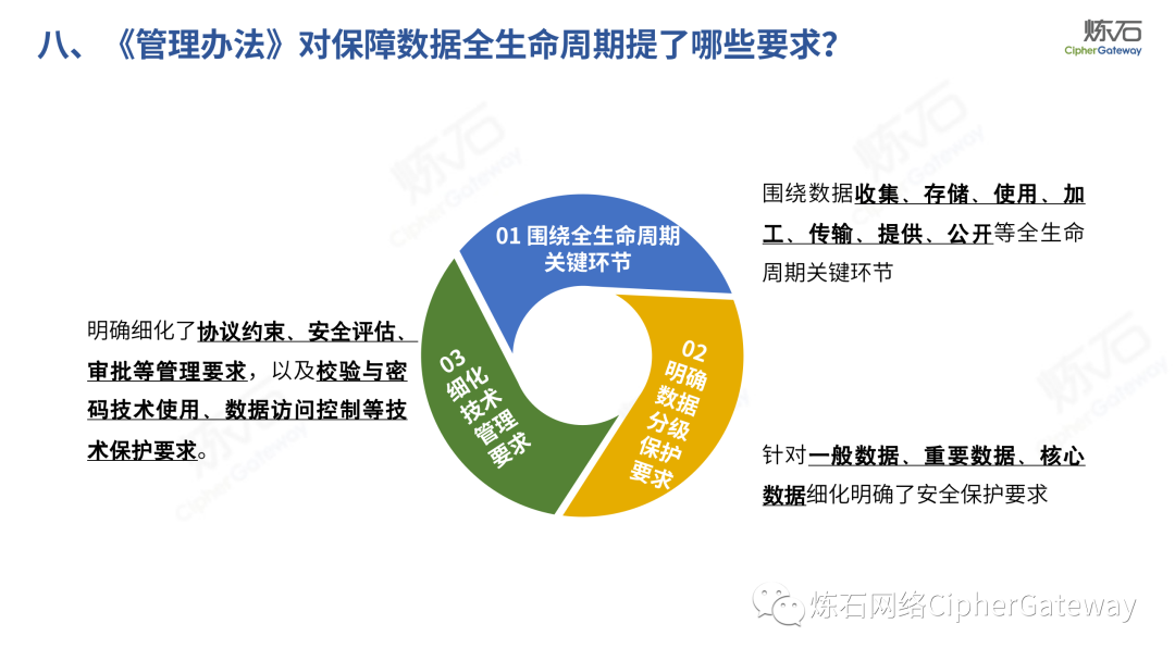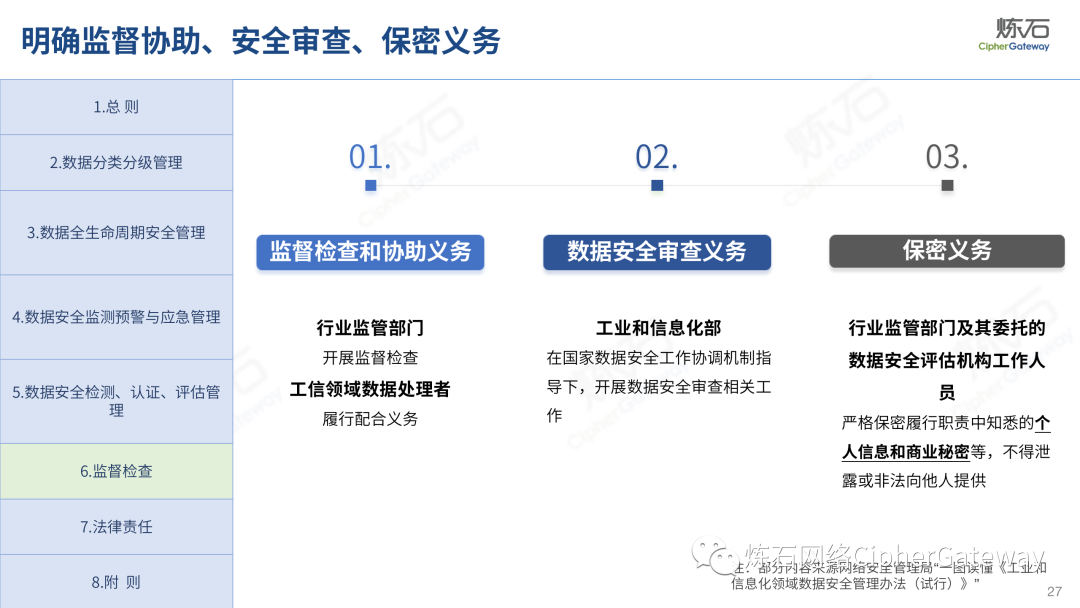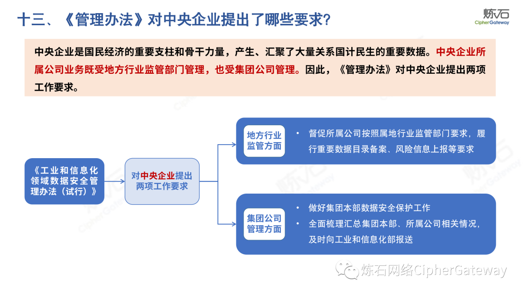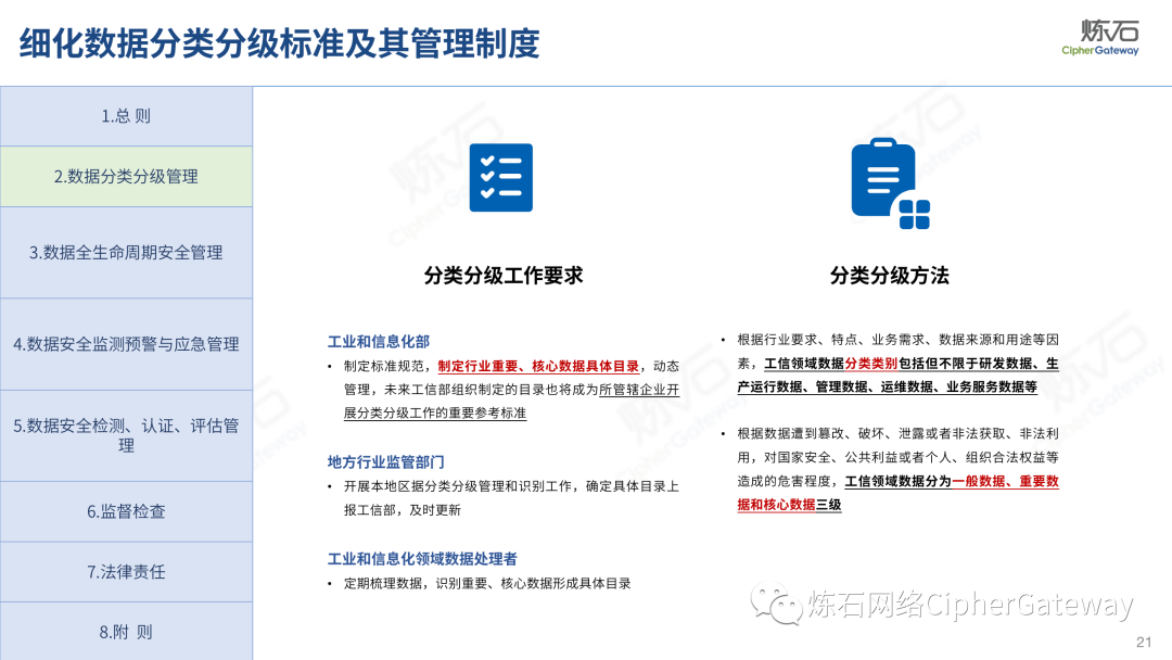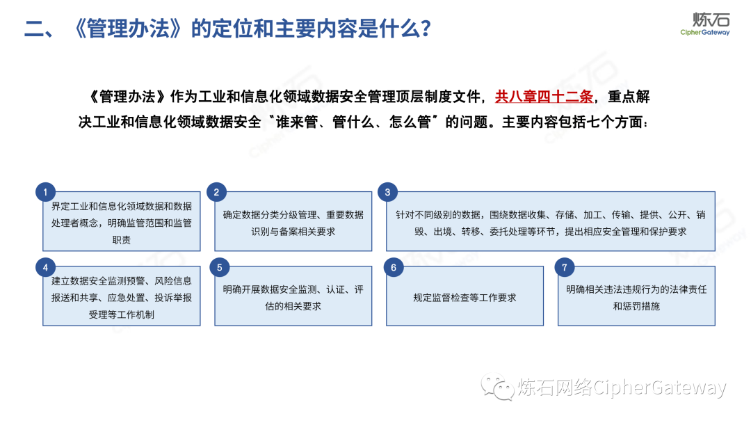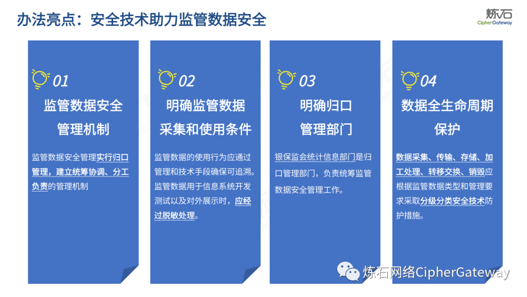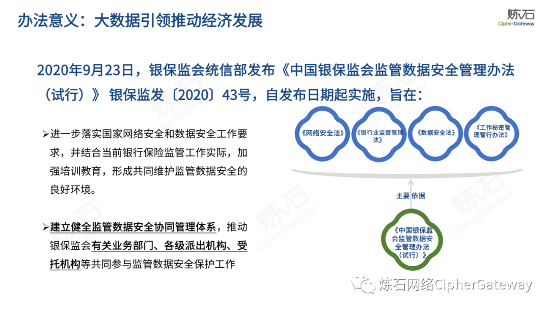 对此,炼石重点解读《工业和信息化领域数据安全管理办法(试行)》,并提供了正式稿与征求意见稿的修订对比,以期为数据安全产业同仁提供参考。《数据安全法》提出“各地区、各部门对本地区、本部门工作中收集和产生的数据及数据安全负责”,除工信领域外,金融、交通、医疗、教育等行业均颁布相应法规,以数据安全保障数据开发利用,推动行业数字化发展。炼石同时整理了中国银保监会、交通运输部、国家医疗保障局、教育部等兄弟部门出台的数据法规,作为对照,可更深入理解各行业数据安全法规特点。