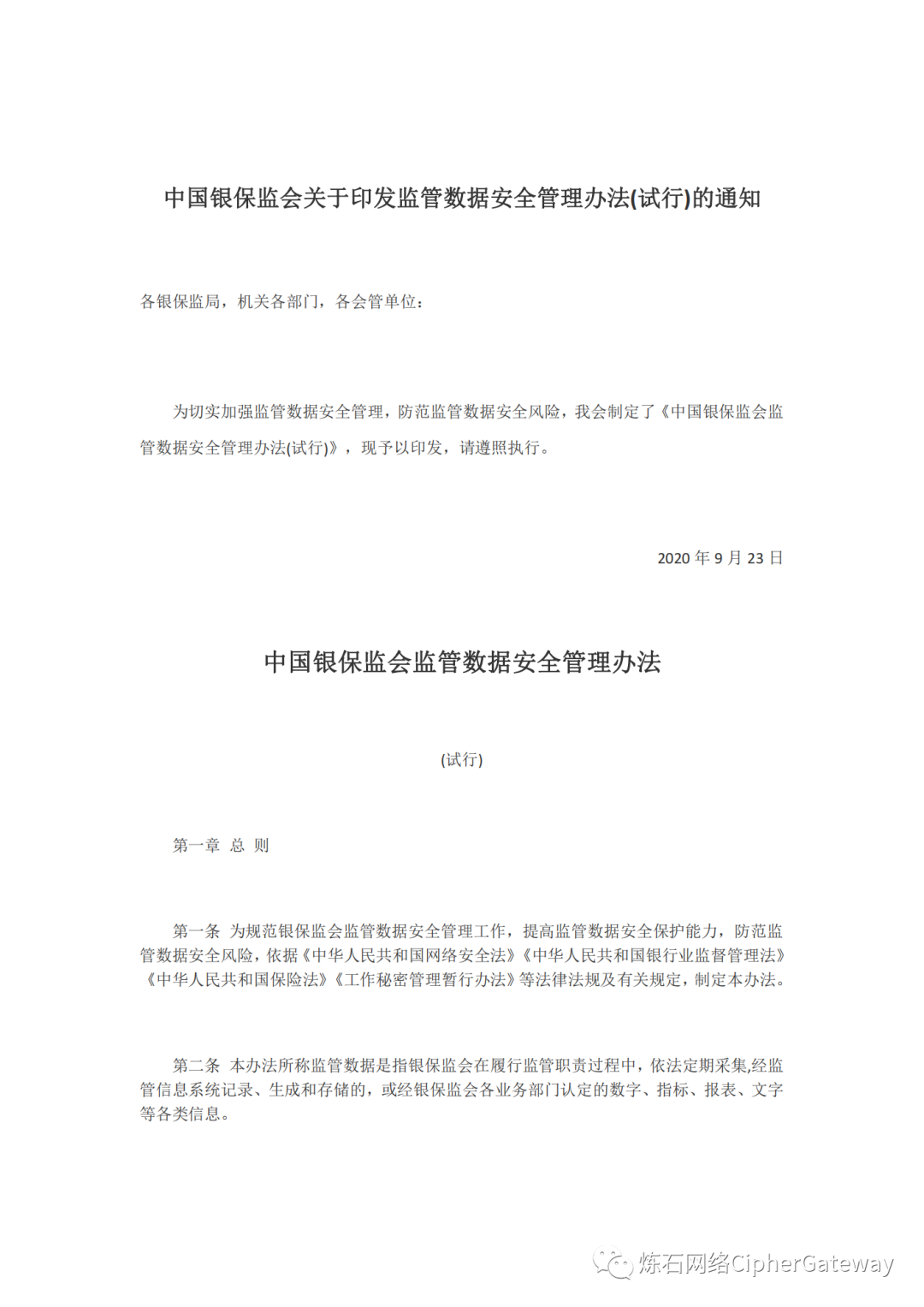 《中国银保监会监管数据安全管理办法(试行)》