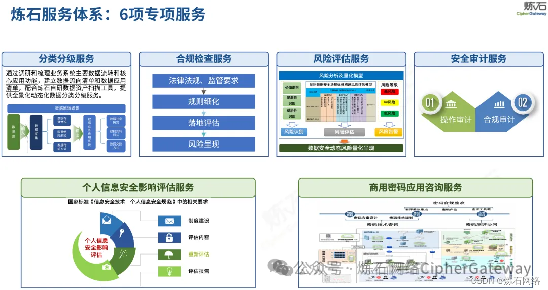 炼石服务能力助力数据安全体系建设。炼石持续组建专业高效的技术和服务队伍,打造4项通用服务和2项专项咨询服务,让数据安全防护成效实现“1+1>2”,可支撑开展分类分级、合规检查、风险评估、安全审计、个人信息安全影响评估、商用密码应用咨询等专项工作,满足数据安全领域技术咨询、合规建设及决策建议等诉求,提高国家基础信息网络和重要信息系统的数据安全保障能力。
