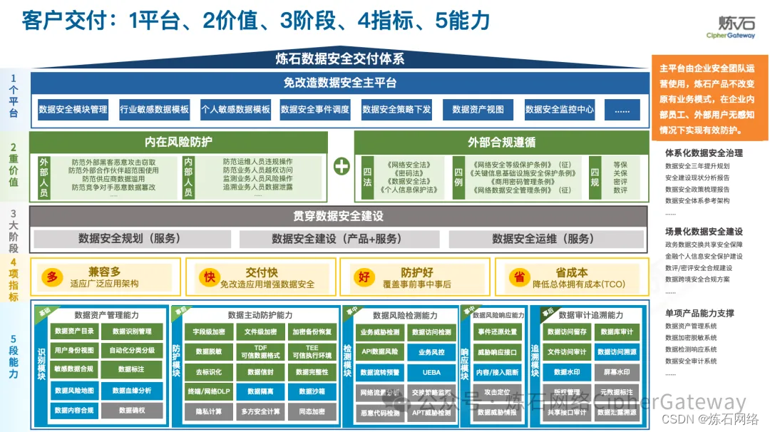 3大阶段。免改造数据安全交付体系贯穿数据安全建设,打造成熟标准化产品与交付体系,覆盖头部行业客户试点与推广复制。目前,炼石已形成了成熟标准化产品与交付体系,包括前期数据安全规划(服务)、中期的数据安全建设(产品+服务)和后期数据安全运维(服务)等,能够满足政府、金融、运营商、教育医疗文旅、工业等行业客户,在个人信息保护、商业秘密保护、数据安全合规改造、国密合规改造等业务场景需求。同时,炼石进一步强化配套服务体系,致力于满足企业和组织发展战略、合规要求和风险治理等诉求。