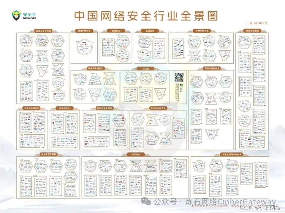 2024年4月12日,国内专业安全媒体安全牛发布《中国网络安全行业全景图(第十一版)》。第十一版全景图划分了16个一级安全分类和108个二级安全分类,汇集了510家安全厂商申报,实际收录为454家。全景图综合考量了产品的实用性、技术的前沿性及市场竞争力,覆盖了网络数据安全的关键技术领域,致力于进一步对行业动态、技术进步和产品效能进行精确的梳理与客观评价。