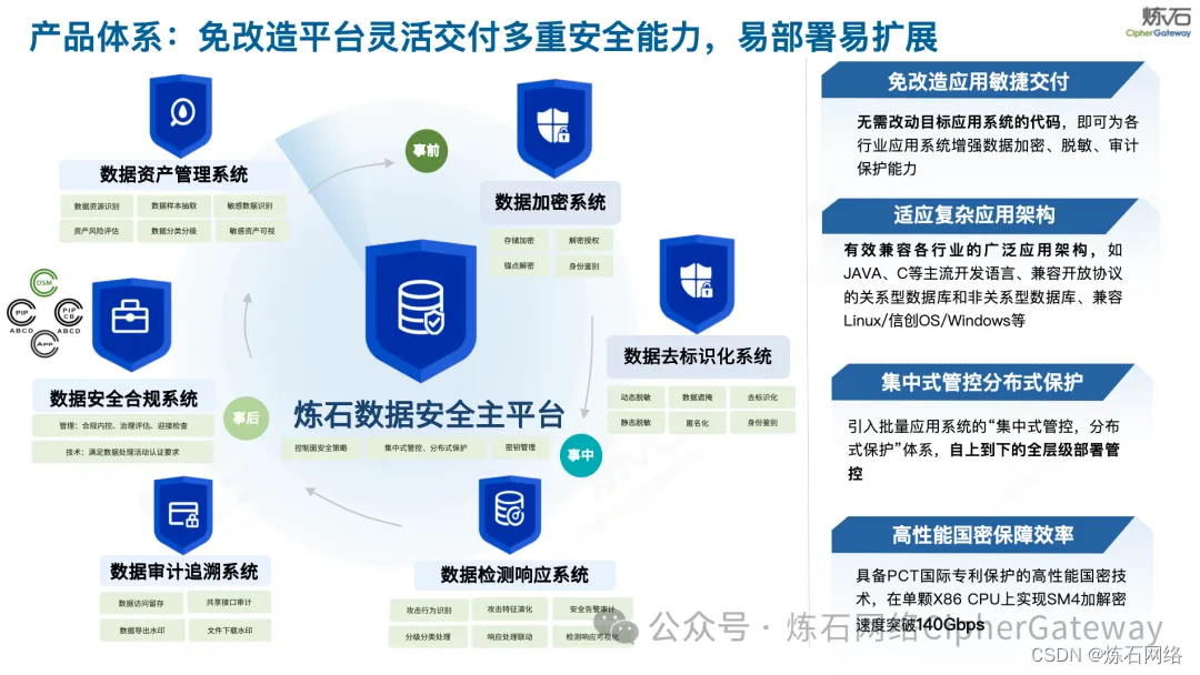 免改造数据安全产品体系,灵活交付多重安全能力。炼石自研免改造的全面数据保护产品,形成包含“一平台:数据安全主平台,多模块:识别、防护、检测响应、审计追溯以及安全合规等安全能力模块”的数据安全产品矩阵,具有应用架构兼容多、免改造应用交付快、密码安全一体化防护好、安全建设成本省、适应业务数据流向管控准等优势,覆盖事前事中事后的安全防控,为用户数据安全体系建设提供技术支撑,防范化解重大安全风险,增强数据安全保障能力。