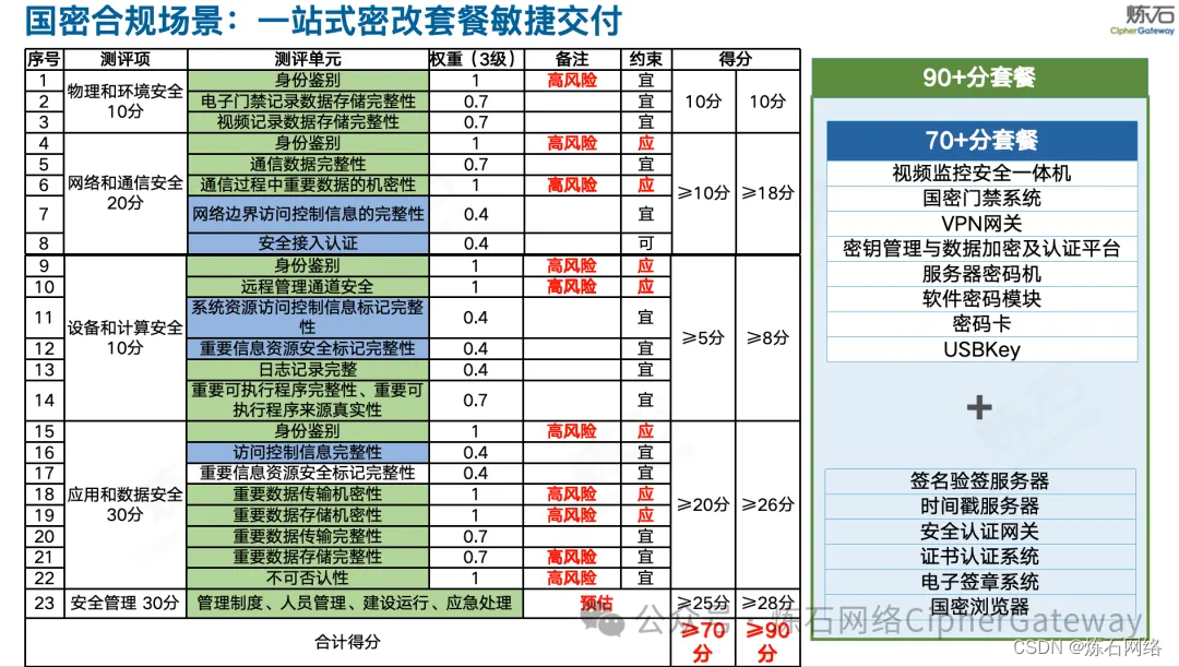 同时,炼石作为专业的“一站式密改敏捷交付厂商”,结合最新密评政策标准文件,针对国密合规场景,推出一站式密改“70+分”、“90+分”套餐,应用系统免改造接入即可实现合规升级。炼石密改方案广泛适用于政务、金融、交通、运营商、医疗、能源、水利、工业等多行业客户,支撑保障关基、等保三级、政务等重要网络与信息系统“三同步、一评估”建设。