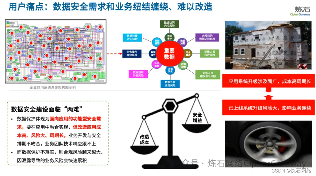 安全与业务纽结缠绕,改造成本抵消安全增益陷入两难。在实践应用中,炼石发现数据安全建设最大痛点在于,安全机制和业务处理纽结缠绕、难以改造。例如,个人信息与重要数据保护主要是面向应用的功能型安全需求,容易遇到业务与安全研发排期不吻合,业务团队技术与响应跟不上;功能型安全需求要在应用中融合实现,但改造应用成本高、风险大、周期长;数据保护不落实,则合规风险越来越大、因泄露导致的业务风险会快速累积等问题。放眼数字化转型及数字经济产业发展,不仅是CPU、操作系统、数据库等基础软件的升级,涉及广泛行业应用软件亟待升级替换是更大的市场空间,比如制造业的PLM/MES/ERP软件、医疗行业HIS软件、金融行业应用软件、能源行业应用软件、交通行业应用软件等等。这些巨大存量的应用软件普遍缺失内建安全机制,缺乏有效手段增强数据安全能力,因为无法破解开发改造模式成本极高、影响业务连续性,还有源代码维护等技术可行性挑战。这也意味着,应用改造带来的高难度、高风险、长周期,再叠加复杂的数据安全能力,使得企业投入成本在一定程度上抵消了安全带来的增益,企业数据安全建设面临“不改有风险、强改会要命”的两难困境。