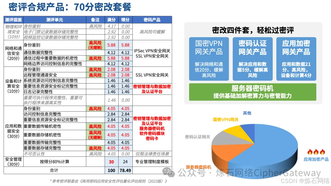 密改四件套,轻松过密评。炼石是专业的“一站式密改敏捷交付厂商”,结合最新密评政策标准文件,针对国密合规场景,推出“密改四件套”产品,以及一站式密改“70+分”套餐,实现应用系统免改造接入即可实现合规升级。密改四件套主要包括国密VPN网关产品、密码认证网关产品、应用加密盒子产品和服务器密码机。其中,国密VPN网关产品主要解决网络和通信安全测评项;密码认证网关产品主要解决应用和数据安全测评项;应用加密盒子产品主要解决应用和数据安全测评项、设备和计算安全测评项;服务器密码机主要提供基础加解密算力与密管能力。炼石密改方案广泛适用于政府、金融、交通、电信、医疗、教育、工业、能源、商业等多行业客户,支撑保障关基、等保三级、政务等重要网络与信息系统“三同步、一评估”建设。