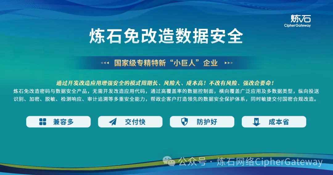 炼石作为以“免改造”为创新特色的数据安全产品厂商,不仅是国家级专精特新“小巨人”企业,更是上海网络安全应急支撑体系的积极参与者。基于自主研发的免改造数据安全系列产品,通过可适配企业应用架构的一系列数据控制面,对流动数据高覆盖率识别与控制,横向覆盖广泛应用、纵向叠加识别、加密、去标识化、检测/响应、审计追溯等多阶安全能力,在数据收集、存储、使用、加工、传输、提供等各环节提供有效数据保护,可在不影响业务的前提下敏捷实施上线,将安全与业务在技术上解耦、但又在能力上融合交织,打造安全机制与业务处理紧密融合的实战化数据防护体系。目前,炼石已交付超两百家行业头部客户,产品已生产级部署在政府、金融、交通、电信、医疗、教育、工业、能源、商业等行业用户广泛的关键应用系统,当前实时保护着超千套应用、十多亿人口信息、数千亿条敏感数据。