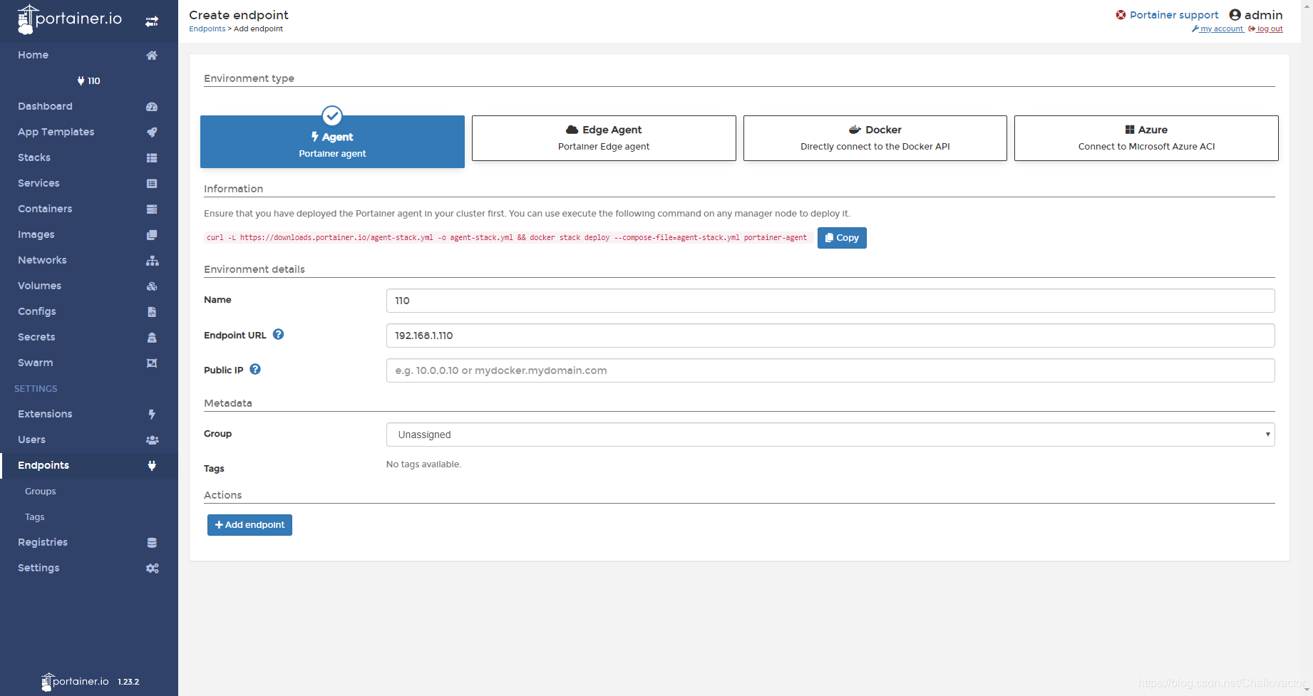 这里以添加192.168.1.110的机器为例,Endpoint的名称以ip地址命名,然后就是要填写Endpoint URL,节点的IP地址以及Portainer Agent的端口号,即192.168.56.110:9001