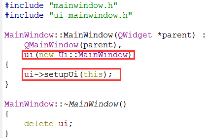 4、通过实例化ui对象,调用setupUi函数把界面显示出来,setupUi()函数为界面传入了父窗口并实例化界面中的各个窗口部件,这种做法使Qt把UI界面与逻辑功能分离出来。