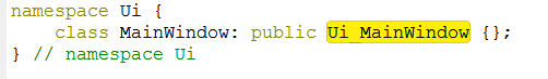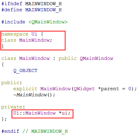 3、在mainwindow.h中,会看到在Ui命名空间中对MainWindow进行声明,这个MainWindow并不是mainwindow.h中定义的MainWindow类,而是在第二点处定义的继承Ui_MainWindow的类,并在新定义的MainWindow类中声明一个Ui::MainWindow的指针ui: