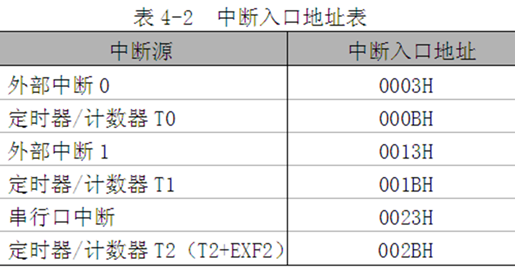 - 各中断源服务程序的入口地址(也称中断矢量)是固定的 ,如表4-2所示。
