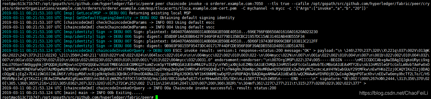 peer chaincode invoke -o orderer.example.com:7050 --tls true --cafile /opt/gopath/src/github.com/hyperledger/fabric/peer/crypto/ordererOrganizations/example.com/orderers/orderer.example.com/msp/tlscacerts/tlsca.example.com-cert.pem -C mychannel -n mycc -c '{"Args":["invoke","a","b","20"]}'
