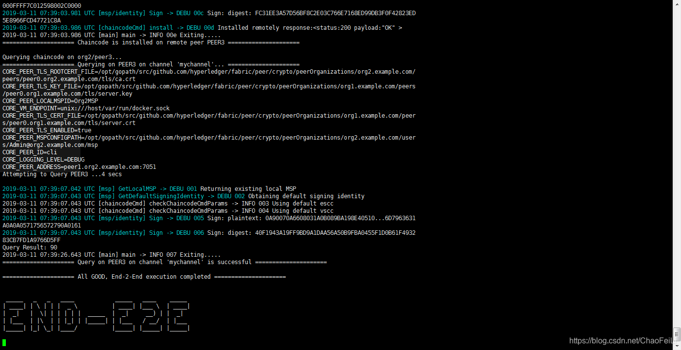 我们仍然停留在e2e_cli文件夹,这里提供了启动、关闭Fabric网络的自动化脚本。我们要启动Fabric网络,并自动运行Example02 ChainCode的测试,执行一个命令: