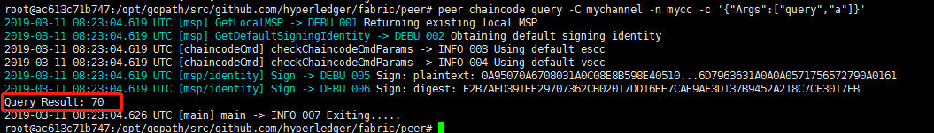 peer chaincode query -C mychannel -n mycc -c '{"Args":["query","a"]}'