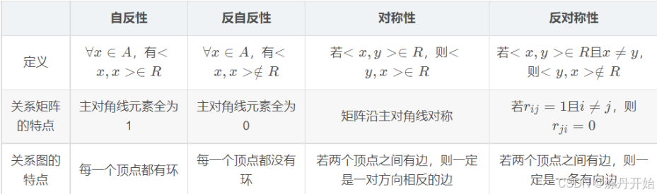 - 反自反性是指对于集合 A 中的任意元素 x,都有 (x,x)∉R;关系矩阵的特点是主对角线元素全为0,关系图的特点是每一个顶点都没有环;