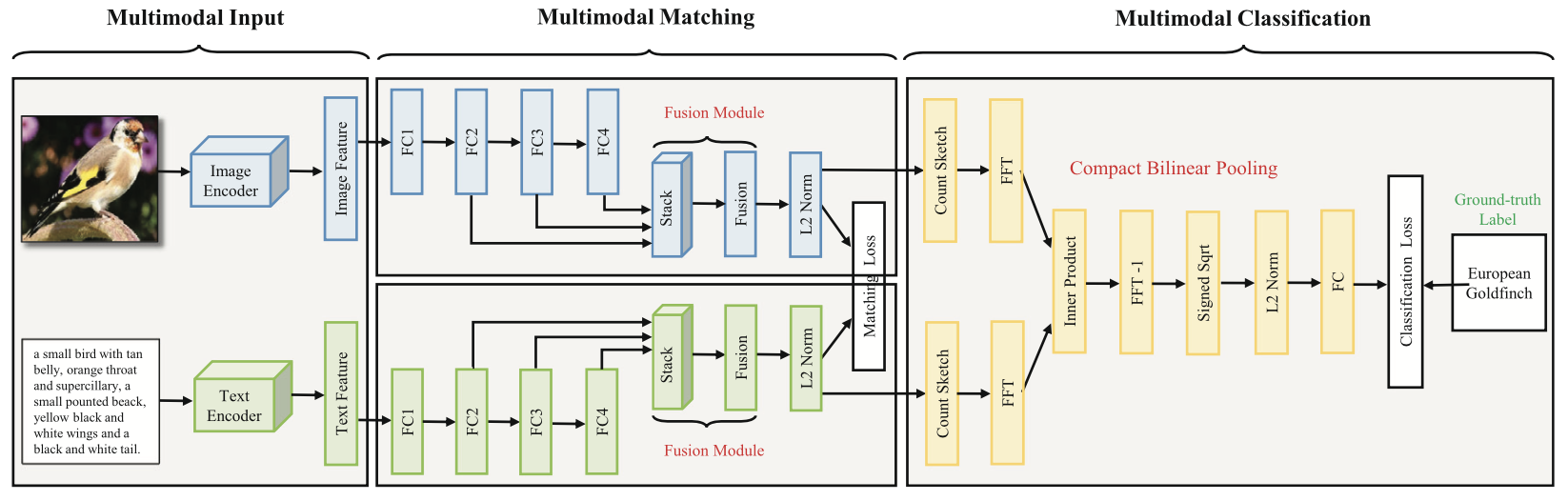 在此基础上,多模态分类模块进一步利用图像与文本的嵌入特征,通过紧凑型双线性池化(Compact Bilinear Pooling)生成高阶且具有判别力的多模态表示向量。该表示随后用于计算与预定义标签之间的分类损失,实现对目标类别的精确预测。