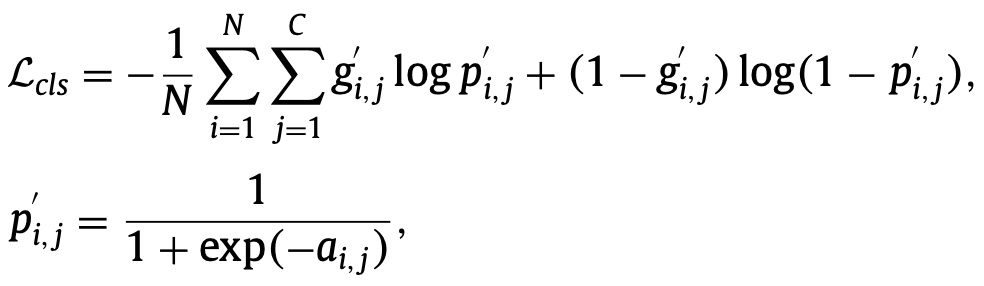 对于多标签分类任务,图像可能同时属于多个类别,因而提供了更丰富的语义信息。在这种情形下,本项目采用 Sigmoid 交叉熵损失函数进行训练,损失函数定义如下: